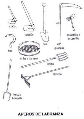 Herramientas del aperador, ya vimos que el aperador era el encargado de arreglar los útiles de la agricultura y él, en su morral de cuero, llevaba siempre una azuela, martillo, azuela angosta, barreno, escoplo, barrenito y hacha, con estas herramientas podía arreglar el resto de aperos y fabricarlos en un momento dado.