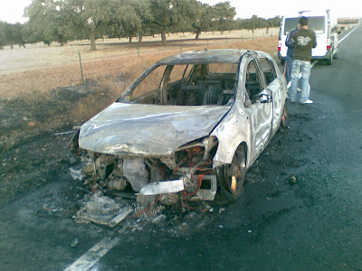 Ocurrió a las 7,30 de la mañana del domingo día 5 de octubre, el coche le salió ardiendo sin más, por suerte se salvo a tiempo , esto es la carretera del Pedroso.