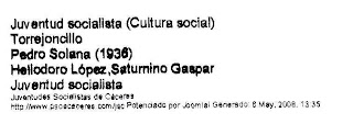 http//www.psoecaceres.com/jsc, página 11 del archivo, aparece juventudes socialistas, y figuran Pedro Solana, Heliodoro López, Saturnino Gaspar, año 1936, Torrejoncillanos de aquella época afiliados.