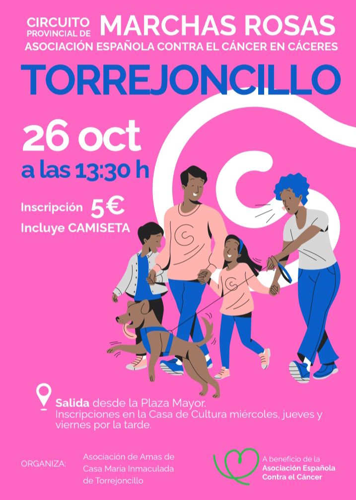 Os esperamos en la plaza mayor para que nos acompañéis a la MARCHA ROSA DE TORREJONCILLO ,en colaboración con la ASOCIACIÓN ESPAÑOLA CONTRA EL CÁNCER.
