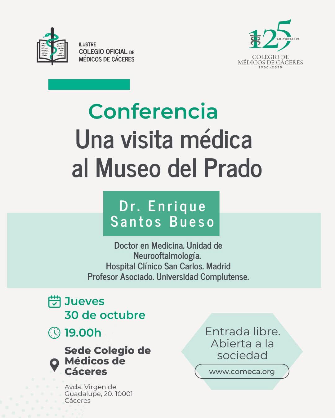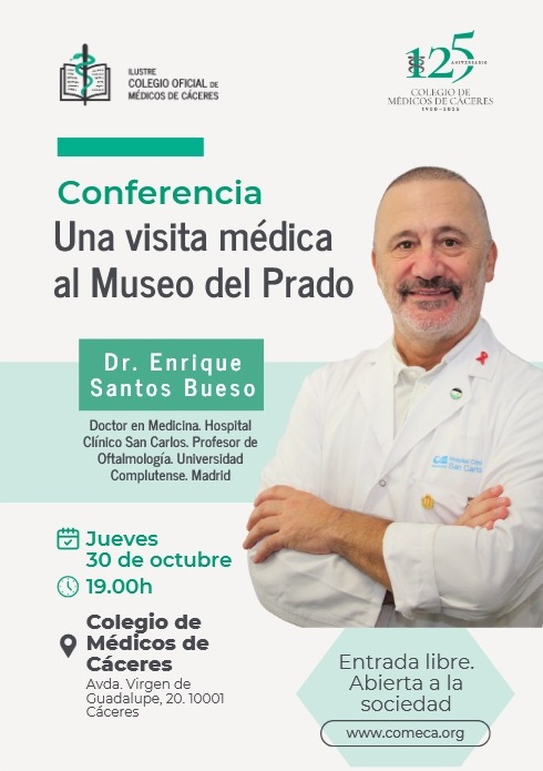 A las 19 horas será el ponente de la conferencia titulada “Una visita médica al Museo del Prado”, en la cual podremos ver, desde el punto de vista oftalmológico, algunas de las fotografías de las algunas de las obras expuestas en dicho museo.
