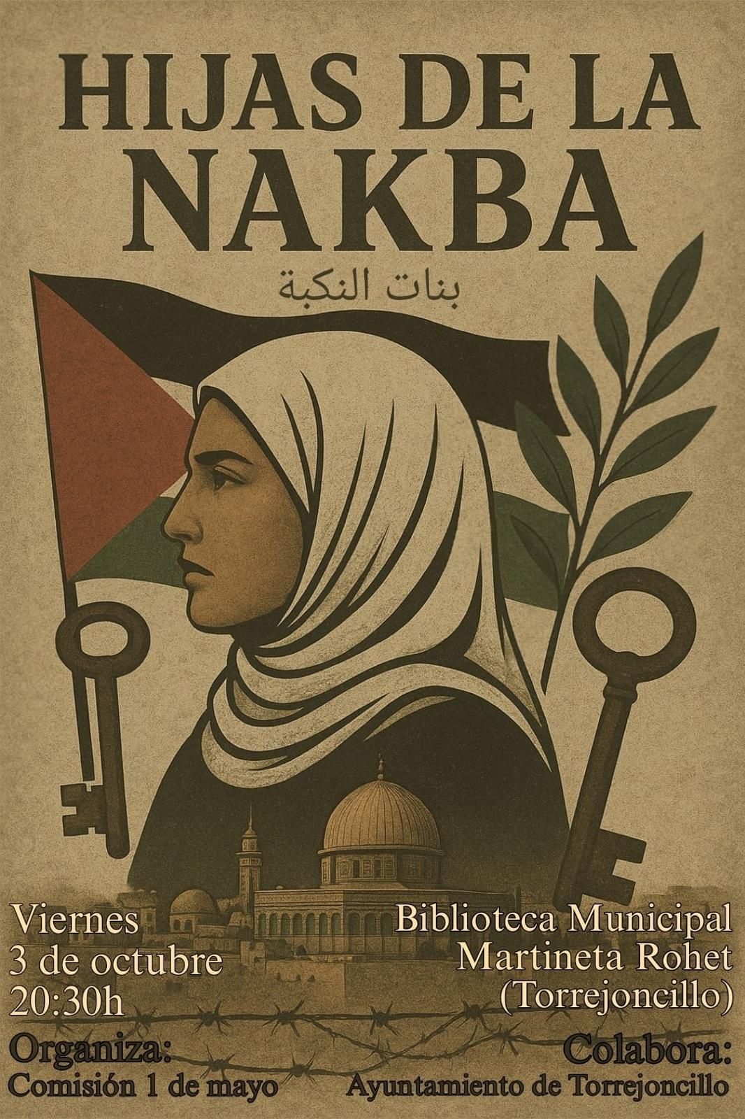 Desde la Comisión de Amigos del 1º de Mayo, se ha programado, en apoyo del pueblo palestino, el visionado del documental: HIJAS DE LA NAKBA, dirigido en 2019 por Estella Vidal. En él se escucha el testimonio valiente de unas mujeres palestinas que narran en primera persona la historia de la ocupación y colonización de Palestina.