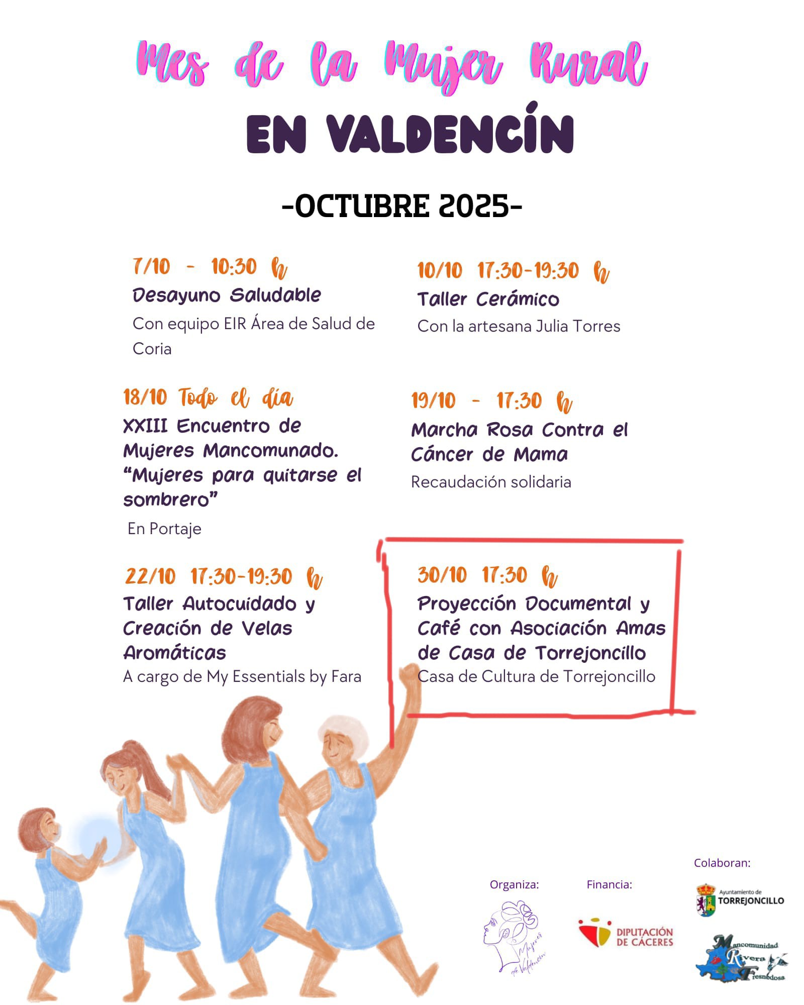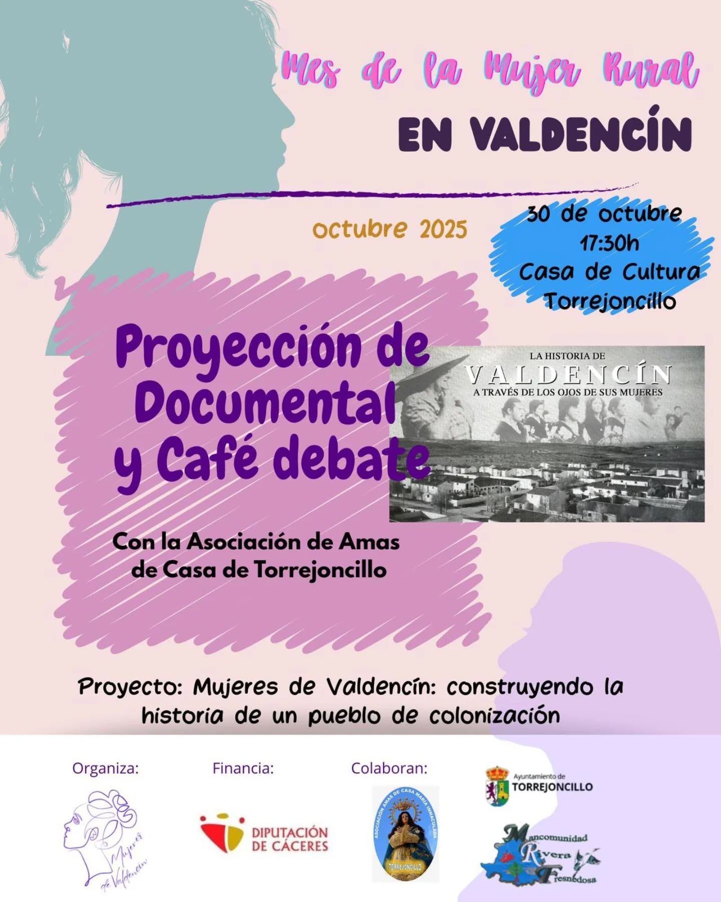 Finaliza el “Mes de la Mujer Rural” en Valdencin, y en este último evento organizado se llevara a cabo, a las 17:30 horas, en la Casa de Cultura de Torrejoncillo, la proyección del documental “La historia de Valdencín a través de los ojos de sus mujeres”