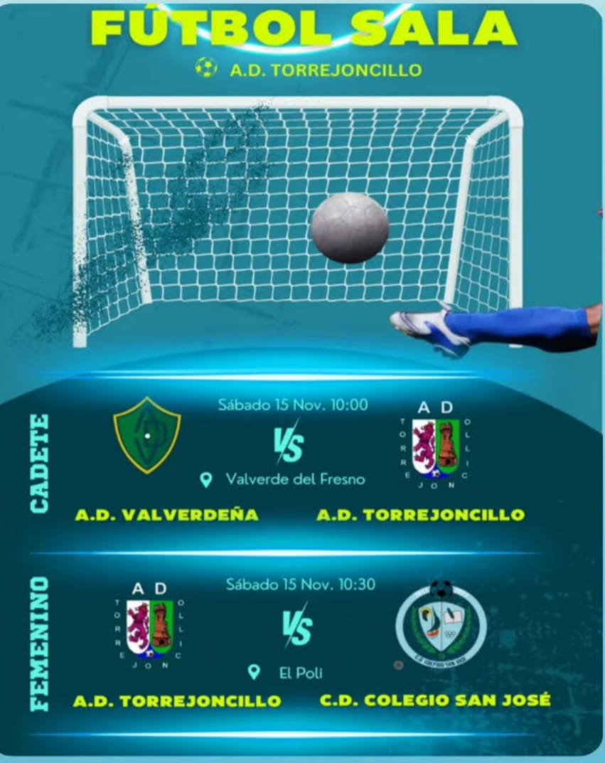 La categoría Cadete del AD Torrejoncillo, participa en la Segunda de Futbol Sala Judex, Grupo 3, perdíamos con ED Unión Fresnedosa ACZ “A” por 1-9. El día 15 a las 10 de la mañana contra el AD Valverdeña será nuestro próximo partido. Somos novenos en la clasificación.