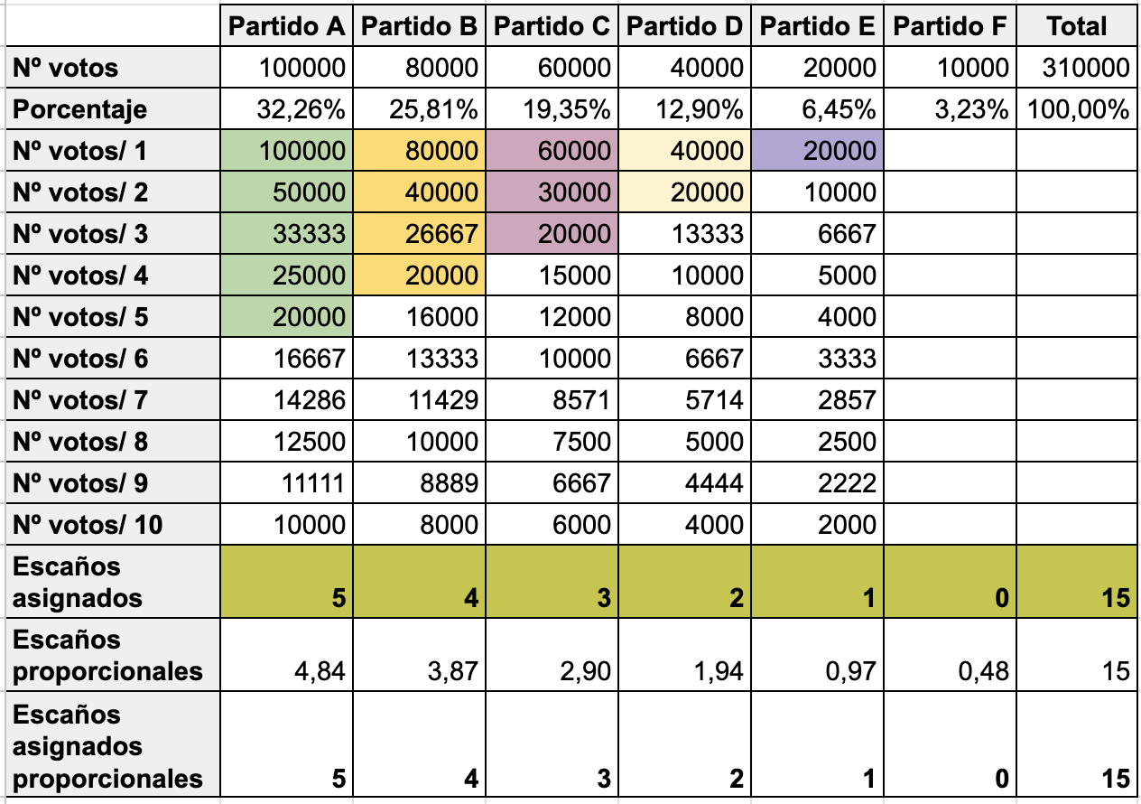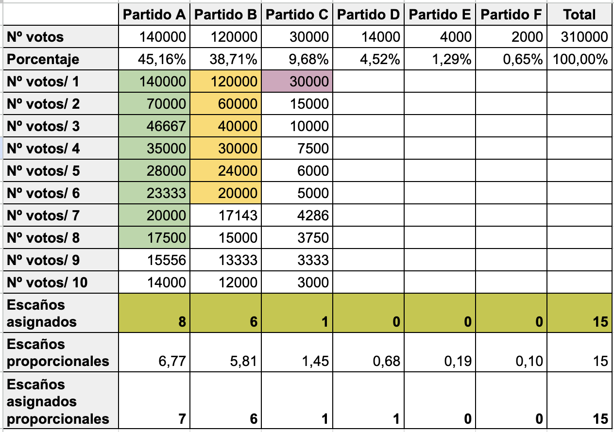 Pero como siempre, esto se ve mejor con un ejemplo, hoy concretamente os traigo dos para que quede claro cómo este sistema de reparto favorece a las fuerzas más votadas.
