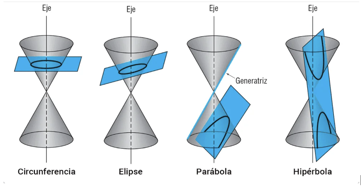Dependiendo de la inclinación que le demos al plano se obtienen estas curvas planas denominadas circunferencia, elipse, parábola e hipérbola.