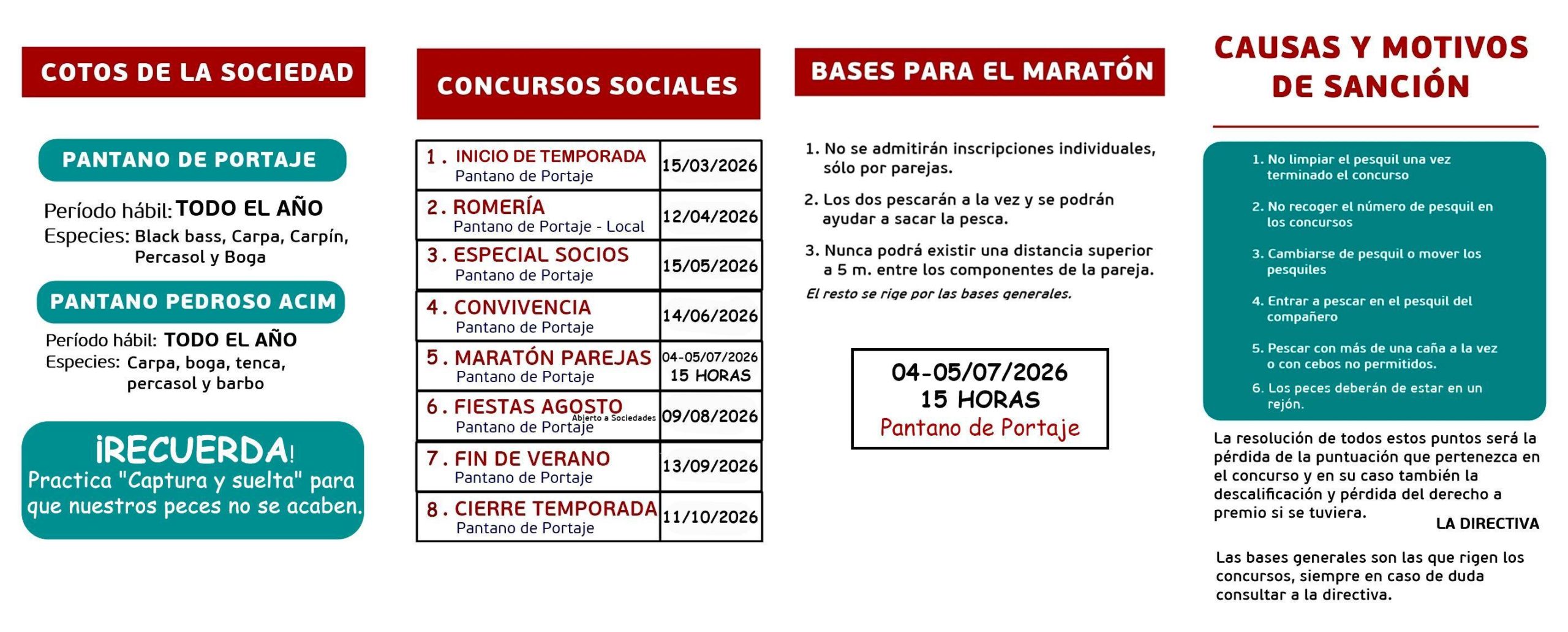 Todos los concursos se llevaran a cabo en el Embalse de Portaje de marzo a octubre de este año 2026.
